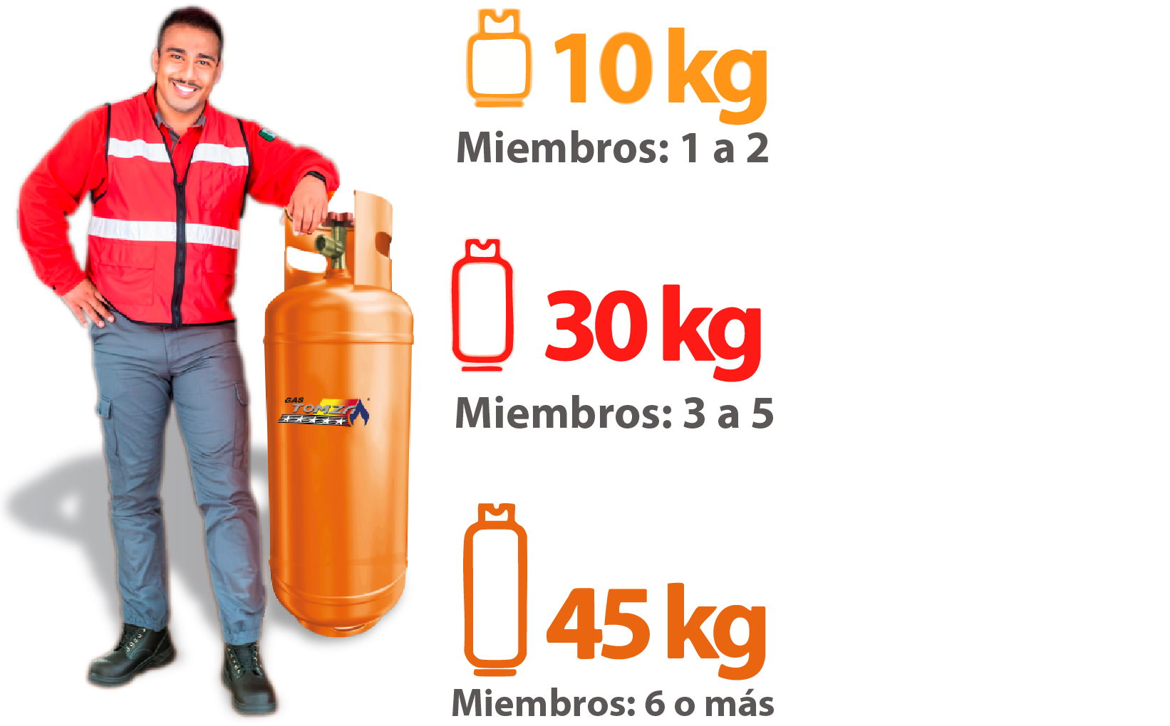 - Recarga de cilindros de 10kg en 32 estaciones de servicio o intercambio de cilindros de 10kg, 30kg y 45kg a domicilio.