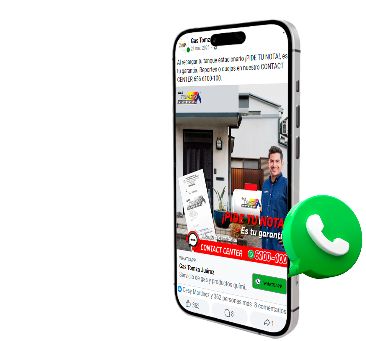 Debe conservar la nota entregada por el cilindrero de Gas Tomza para hacer válida la garantía, comunicarse en un plazo máximo de 24hrs. al Contact Center 656 6100-100 o vía WhatsApp 6100-100 de Gas Tomza para poder realizar el reporte y seguimiento de su queja.